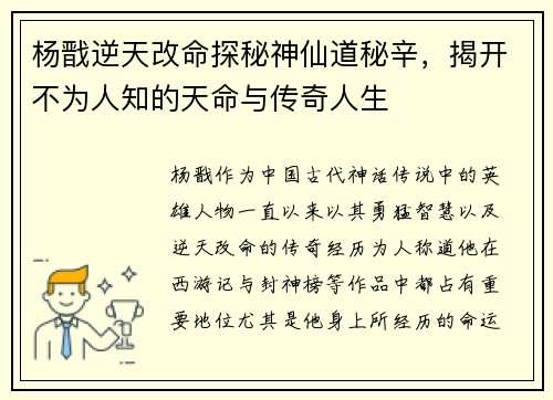 杨戬逆天改命探秘神仙道秘辛,揭开不为人知的天命与传奇人生